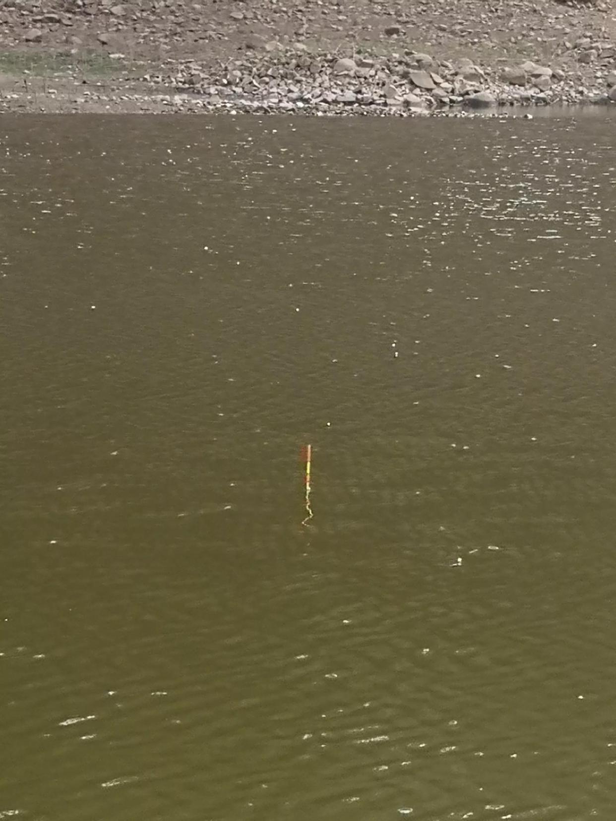 朋友1坐在水库尾巴较细的位置,水面宽度约有20米左右,6.3米鱼竿都快要钓到中间了,水深在1.8米左右。