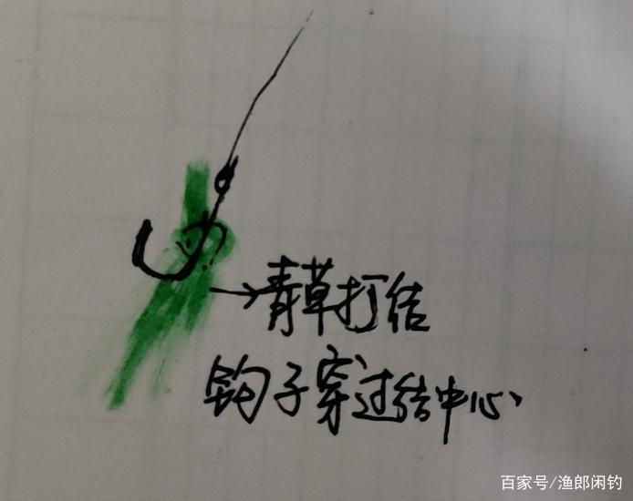 这个是我比较常用的,因为方便。一般在有草鱼的钓点,我都会找找河岸边的一些青草。这些青草是草鱼的自然饵料。用来钓也是很好的,对鱼的警惕性也最小。要注意的是挂草的方法要注意下,我一般如下图