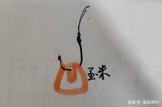 玉米一定要是那种被包裹着的新鲜嫩玉米,不能用老的玉米粒。每次去钓之前,到菜市场买一些,到了钓点剥开,削下玉米粒,越嫩越好,剥下来的玉米皮皮用绳子扎好丢窝点打窝,里面的玉米棒也可以砸碎抛到窝点打窝。嫩玉米挂钩如下图,这样挂的好处是,提竿的时候鱼钩比较容易刺鱼,如果挂厚的那一边,提竿有玉米粒挡着影响鱼钩刺鱼。