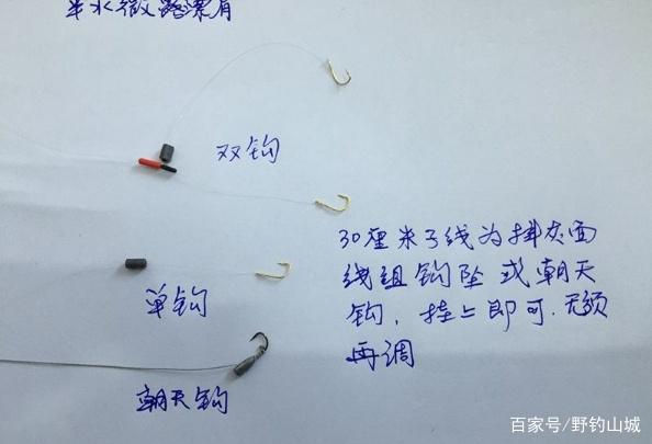 大水面鱼稀,但是多成群,多窝没有意义,大窝才是王道。通常的做法是一位两窝或者比邻两窝(远近或者深浅)。鱼进窝会很慢,需要耐心。 大水面的鱼警觉,它有广阔天地,而你没有,你要吵吵闹闹,它就离你而去,大不了换个食场,留下你独守空房。假如你喜欢吹牛,张扬,活泼好动,还是不要玩手竿手车了,远投,过河钓才适合你。 大水面的鱼会在初冬初春扑边,原因这里不再重复。 大水面能不能抖灰面呢,当然能!附大水面光水钓深我的窝料,线组。 窝料一,谷麦三四把,酒米一两把,煮红苕切大块为主,一窝小半盆。 窝料二,谷麦三四把,酒米一两把,红虫颗粒一两包,小鸡饲料两斤(红塘开水烫软),混合捏成拳头大团,可打两个窝。 线组,长尾立漂,双坠。台钓线组无钩半水调微露漂肩,搞定。子线实际就是抖灰面线组的钩坠,取30厘米挂上即可,无需再调。逗钓轻提至漂平躺。特别注意风线至少1米5以上,短了漂近竿尖,容易缠线。