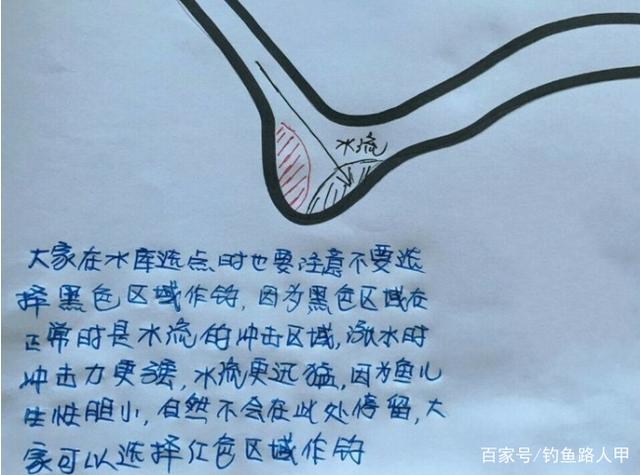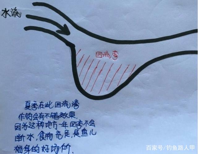 2,洄水湾,钓鱼人都知道选洄水湾,但是洄水湾选择也有诀窍,注意看图片上的水流方向,以及黑红两种颜色区域。虽然同样是洄水湾,但是黑色区域的水流的冲击力明显更急,水流速度更快。鱼儿游动起来需要耗费更多的力气,而沉淀的食物大多数都在红色区域,所以钓红色区域的洄水湾才是正确的。