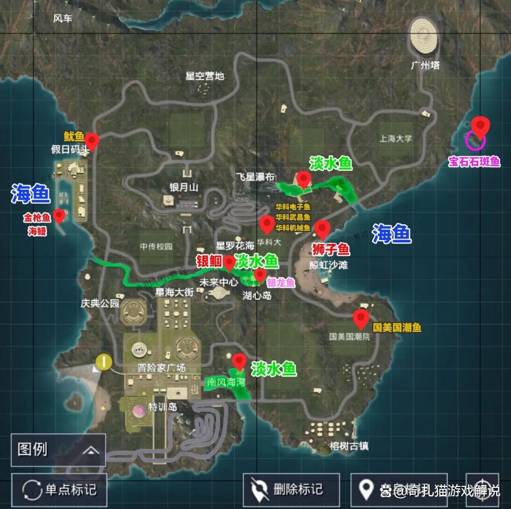 对于淡水河湖鱼和海水鱼的玩家们,可以去标注的几个位置。