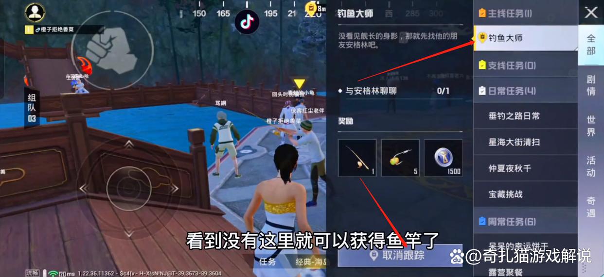 首先需要做一个鱼竿的任务,点击钓鱼大师,然后一定要点击任务下面的“任务跟踪”,然后地图上面就会有一个标记和距离,然后就可以做任务了。
