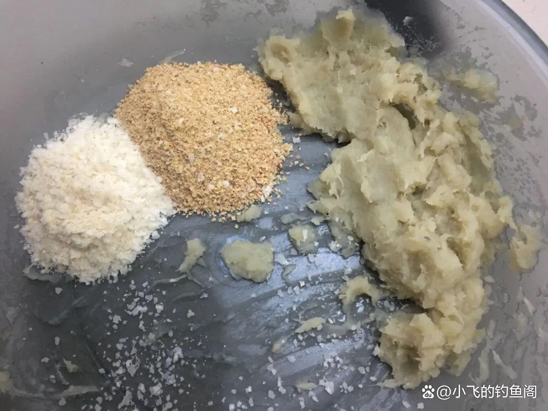 此配方的做法是:黄豆炒香、打碎(可以直接买炒香的黄豆粉),取50毫升,再加20毫升的熟芝麻粉,30毫升的熟玉米粉。这三样东西混合均匀以后,再加入一个熟红薯,红薯的量和这三样饵料加起来的量差不多就行。