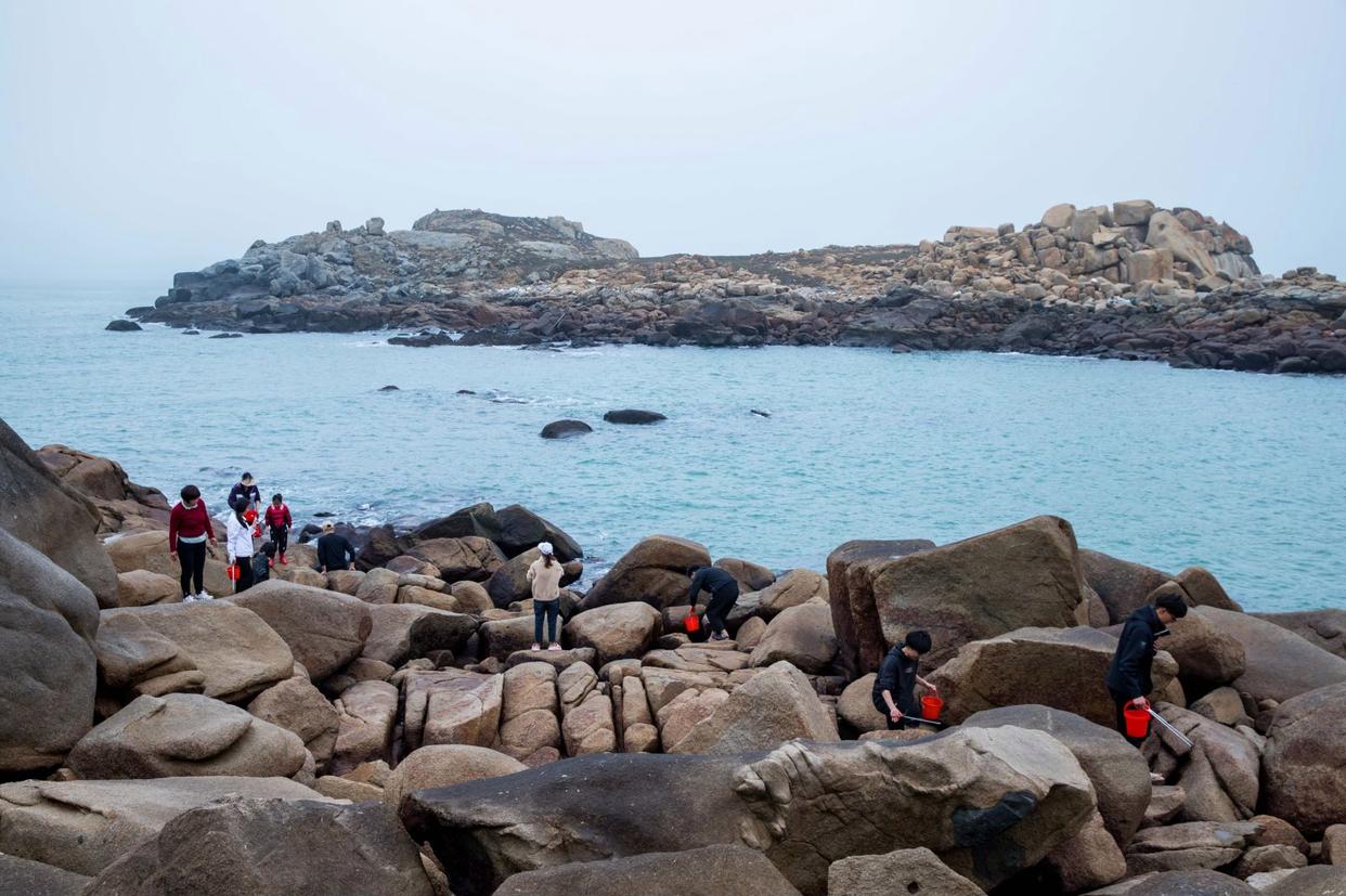 车直接送到码头,其实从悦尚到码头步行也就几分钟的事。快艇在大海中劈波斩浪,直接将我们送到一个无名岛,后来我查到它现在有了一个名字叫姜山岛。来的时候这里已经有不少赶海的客人,拿着钳子,拎着小桶,趁潮水刚退,赶紧在海岛几个礁石滩之间扒拉着。春风满面、笑意融融的美女领队林小岛忙着不停,教大家赶海的技巧,带大家找最合适的位置,我除了寻找海货,沙滩上色彩各异的贝壳也是我收获的目标,可惜出发时慌里慌张的居然给弄丢了,懊恼不已。