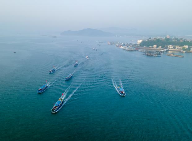 宁海湾的早晨,风平浪静,海天一色。随着长长的鸣笛声,停靠于强蛟镇峡山码头的10余艘钓船齐发,在海湾上划出一道道壮丽的弧线,参赛选手乘风破浪奔赴各个钓点开始比赛。