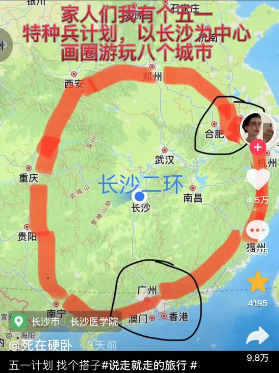 有长沙大学生计划在五一假期以长沙为中心画一个圈,环绕长沙游玩8个城市,简称“长沙二环计划“。