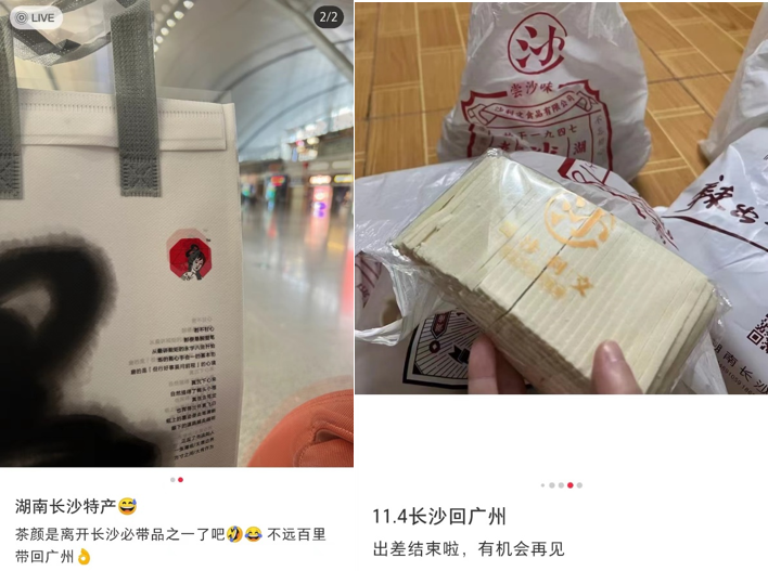 在社交平台,长沙美食也成为广东游客追捧的“当地土特产”,在南站看见提着一袋袋茶颜、中式糕点,大包小包赶高铁的旅客,大概率是广东人带着特产回家了。