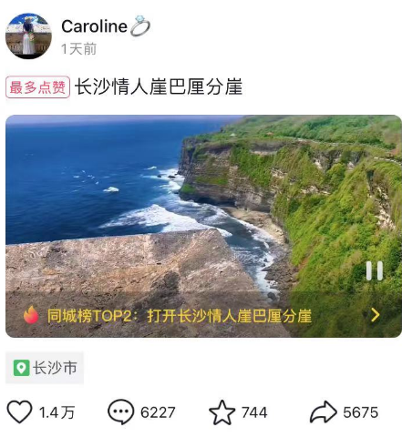 近日,在视频平台一名湖南网友分享了一段在情人崖旅游的海景视频,并配上了“长沙情人崖巴厘分崖”标题简介,视频发布后引起许多长沙网友围观,登上长沙同城热榜第二。