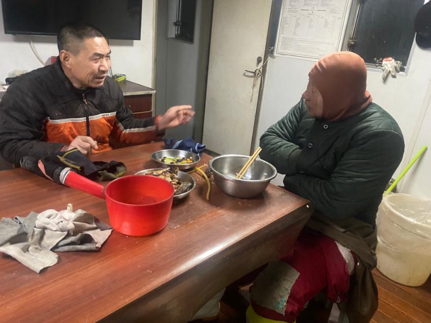 落水者(右)获救后,在“汇泽环保2”轮的餐厅里用餐,与施救船员交流。