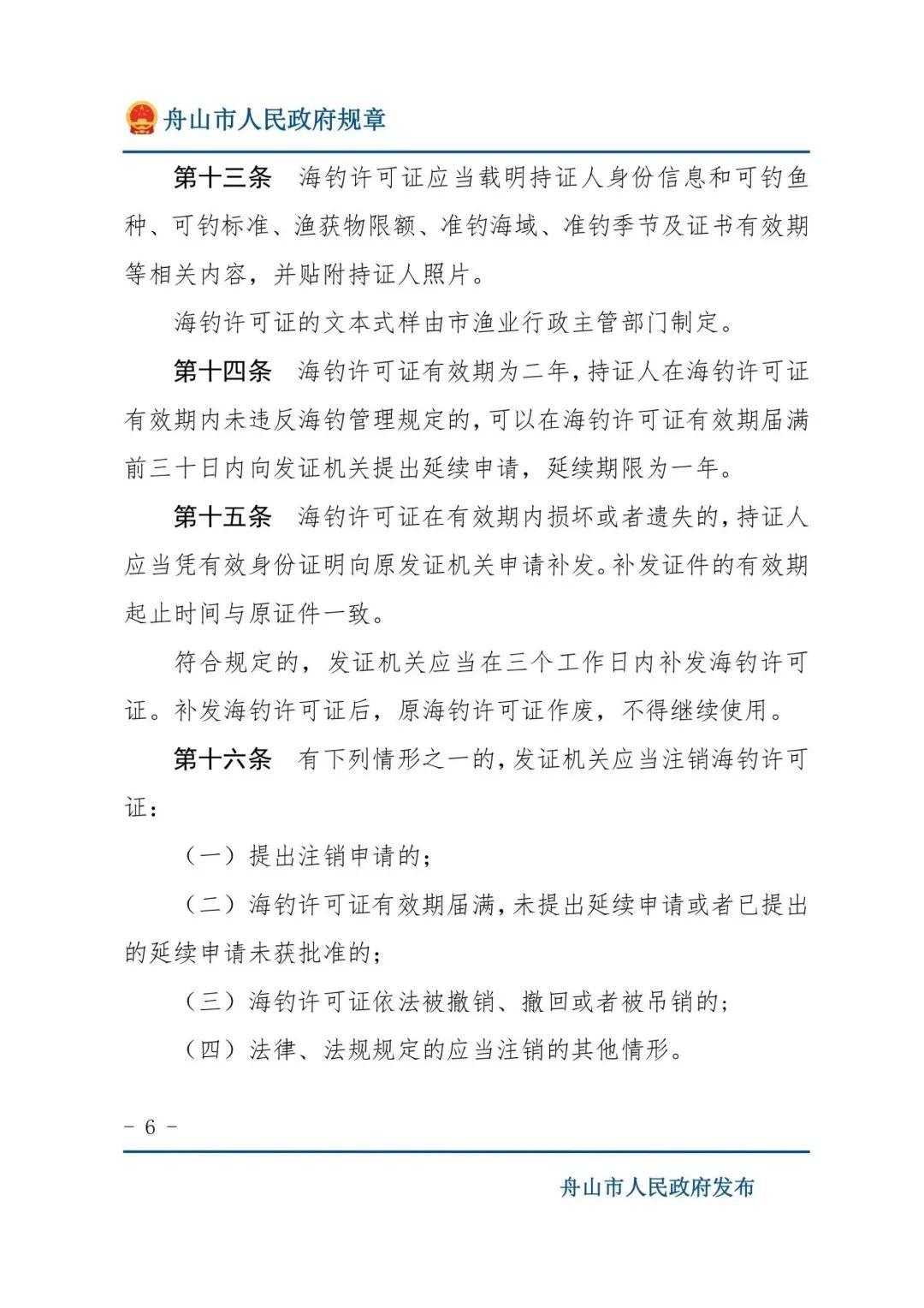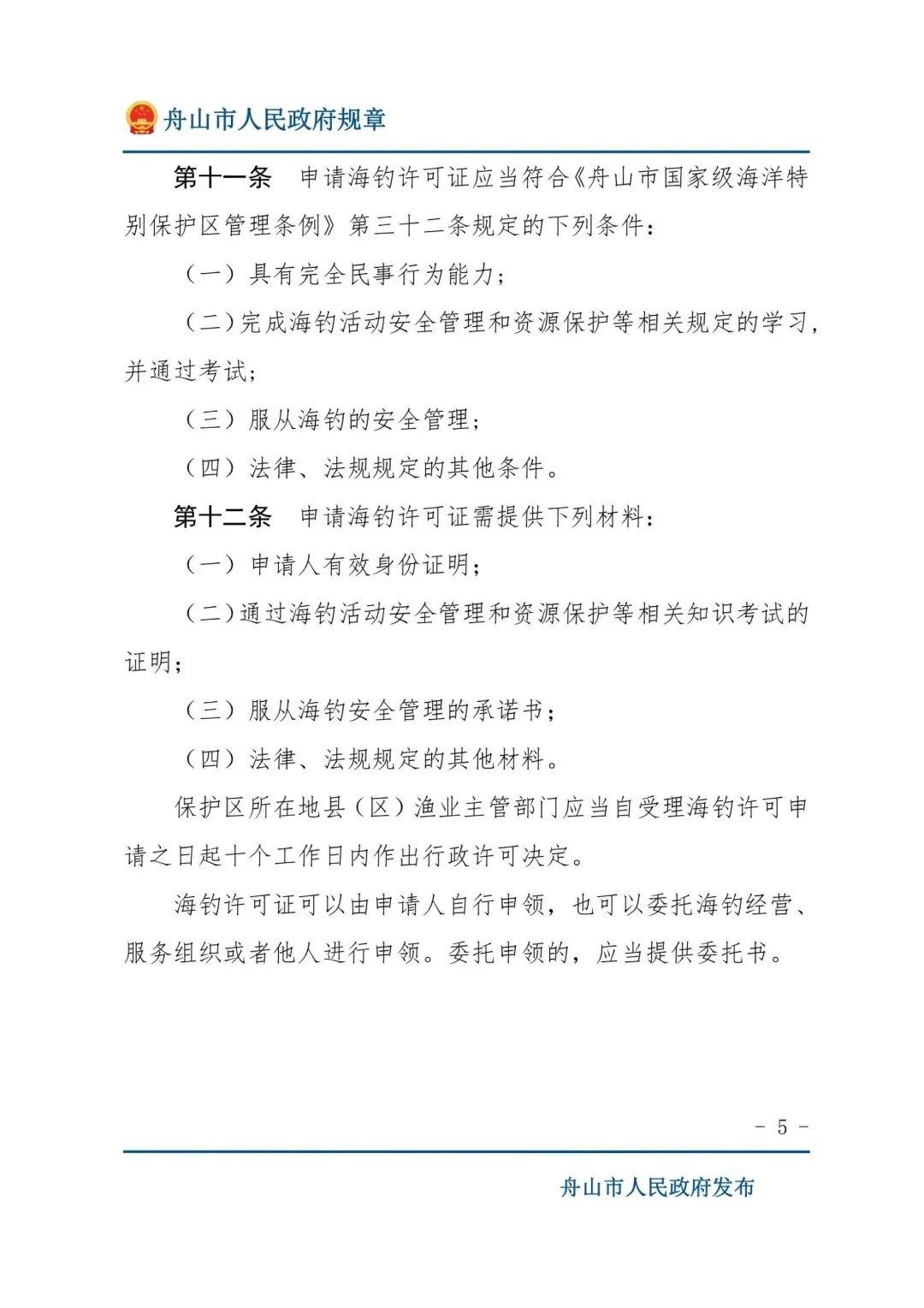 根据《舟山市国家级海洋特别保护区管理条例》关于海钓许可证的设定,明确打造线上线下深度融合、规范高效的审批服务模式,允许委托申领,并规定了许可证应当载明的内容、统一文本式样要求以及许可证的期限、补发和注销情形。