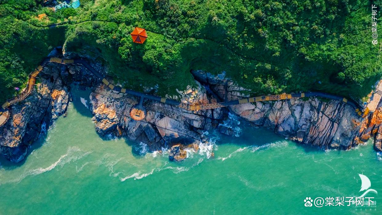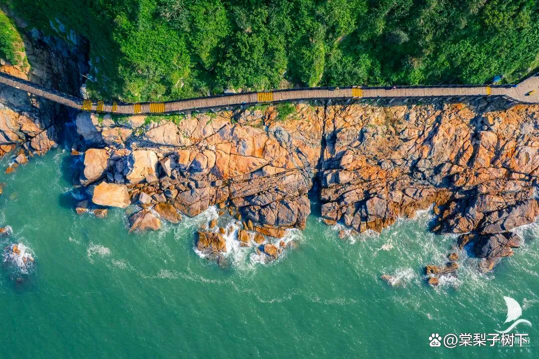 黄褐相间的栈道,印衬着山与海一切色彩明亮,只是太过于浪漫。