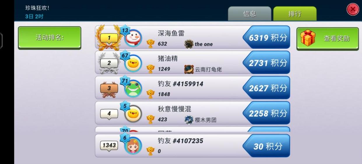 为了鼓励玩家们积极参与活动,《钓鱼大对决》的珍珠狂欢活动设置了相应的积分排行榜,玩家的积分由高到低依次展示,积分越高排名越靠前,并且排名越高奖励也越丰厚。