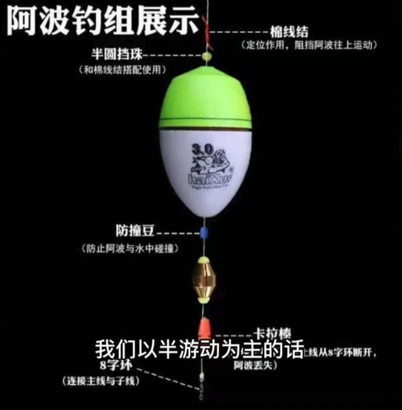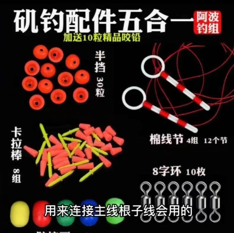 首先你要棉线结和挡斗,用来挡住我们的浮漂,限制我们的做掉深度。然后是浮漂,建议买5b的阿波,一般都适用