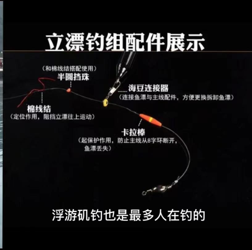 接下来就是绑线组的部分,我们以浮游基调为主,浮游基调也是最多人在钓的,所以我们要先学会浮游基调,有半游动和全游动,我们以半游动为主的话,下面图片中有详细立浮漂钓组配件
