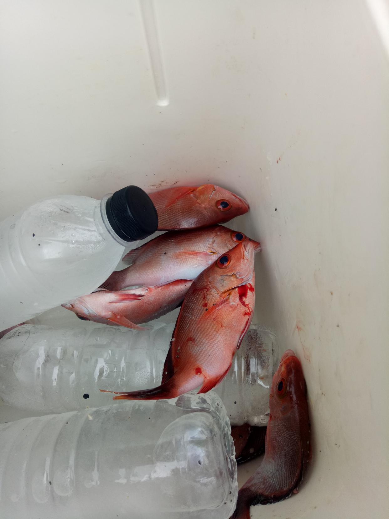 就在此时,我的鱼竿也有了信号,串钩上三枚钩子中了两条,都是红鳍石斑鱼,重3两左右。