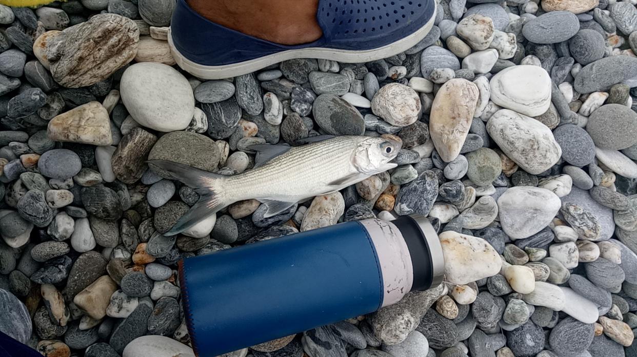 渔港的另一端是沙滩,有人在滩钓,走近一看,两位钓客的小冰桶里几乎塞满了鱼。