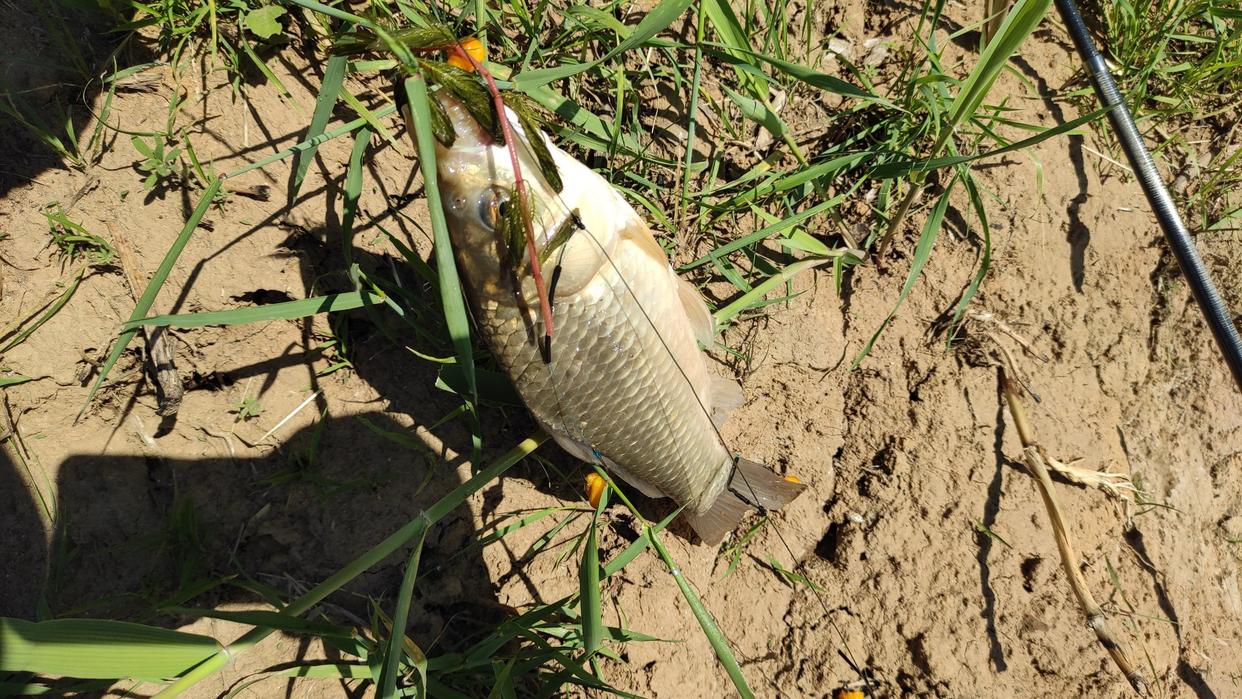 今年春天老弟用矶钓滑漂钓鲫鱼时,在野河就钓了一条17斤的鲤鱼。