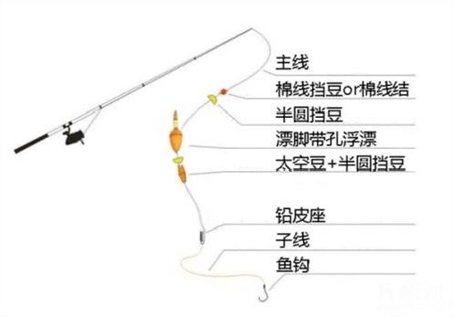 矶钓钓组依次为棉线结、半球挡珠、阿波(浮漂)、防撞豆、太空豆、水中(铅坠)、太空豆、卡拉棒、八字环、子线(1.5-2米)、鱼钩。主线和子线根据对象鱼个体进行选择。