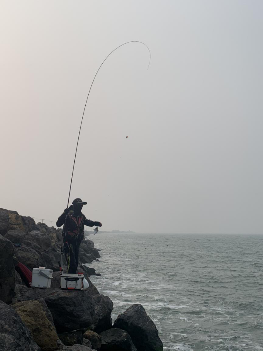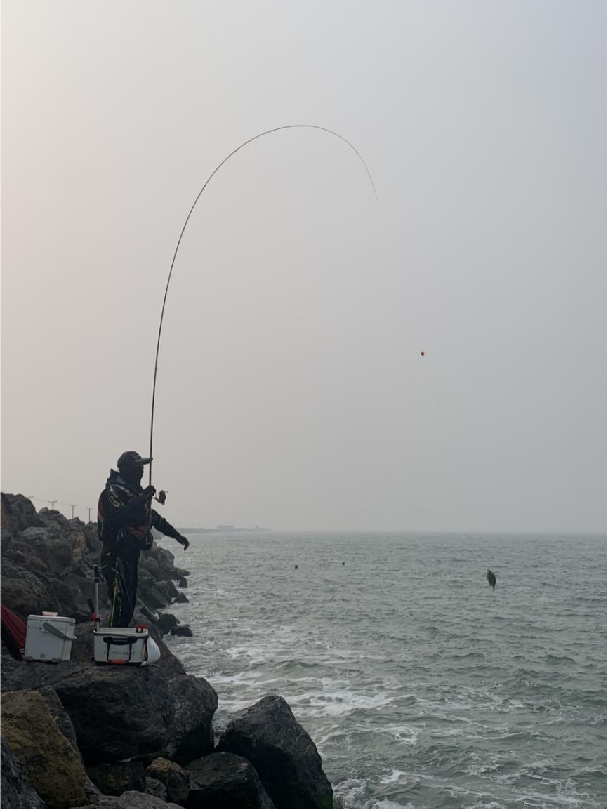 经过1小时左右的车程,我们顺利到达钓场。站在礁石结构的岸线上放眼望去,眼前的海水略微有些浑浊,但是微浪,水温在14℃左右。