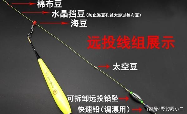漂座、太空豆、铅皮座、八字环、相信大家都会安装,着重讲一下棉线和半圆挡片的装配方法,先从下面的限位太空豆说起,笔者较为喜欢使用太空豆来进行限位,一般是在滑漂座下安装两颗,漂座距离八字环一个半浮漂的距离,浮漂到八字环距离过短抛投时子线会缠绕到浮漂上,使用棉线节加太空挡豆绑线结时绑法较多,下面给大家推荐一种较为简单的绑法,装好半圆挡片后棉线节绑法见下图: