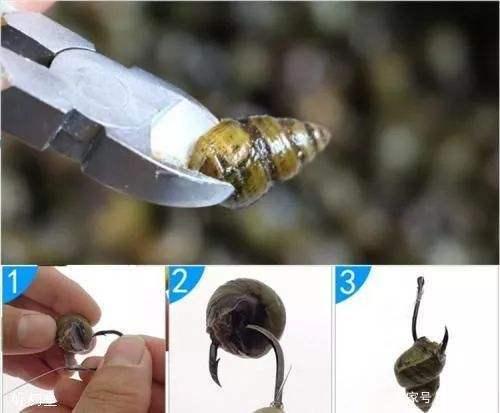 青鱼也被称为螺丝青,原因就是它在自然水域当中,是以田螺为主要的觅食对象。使用田螺垂钓青鱼时,要将鱼钩挂在田螺的壳口背面上,先用利器打孔而后在挂入钩门弯部,不可用鱼钩直接刺破田螺,这样会损伤鱼钩锋利。