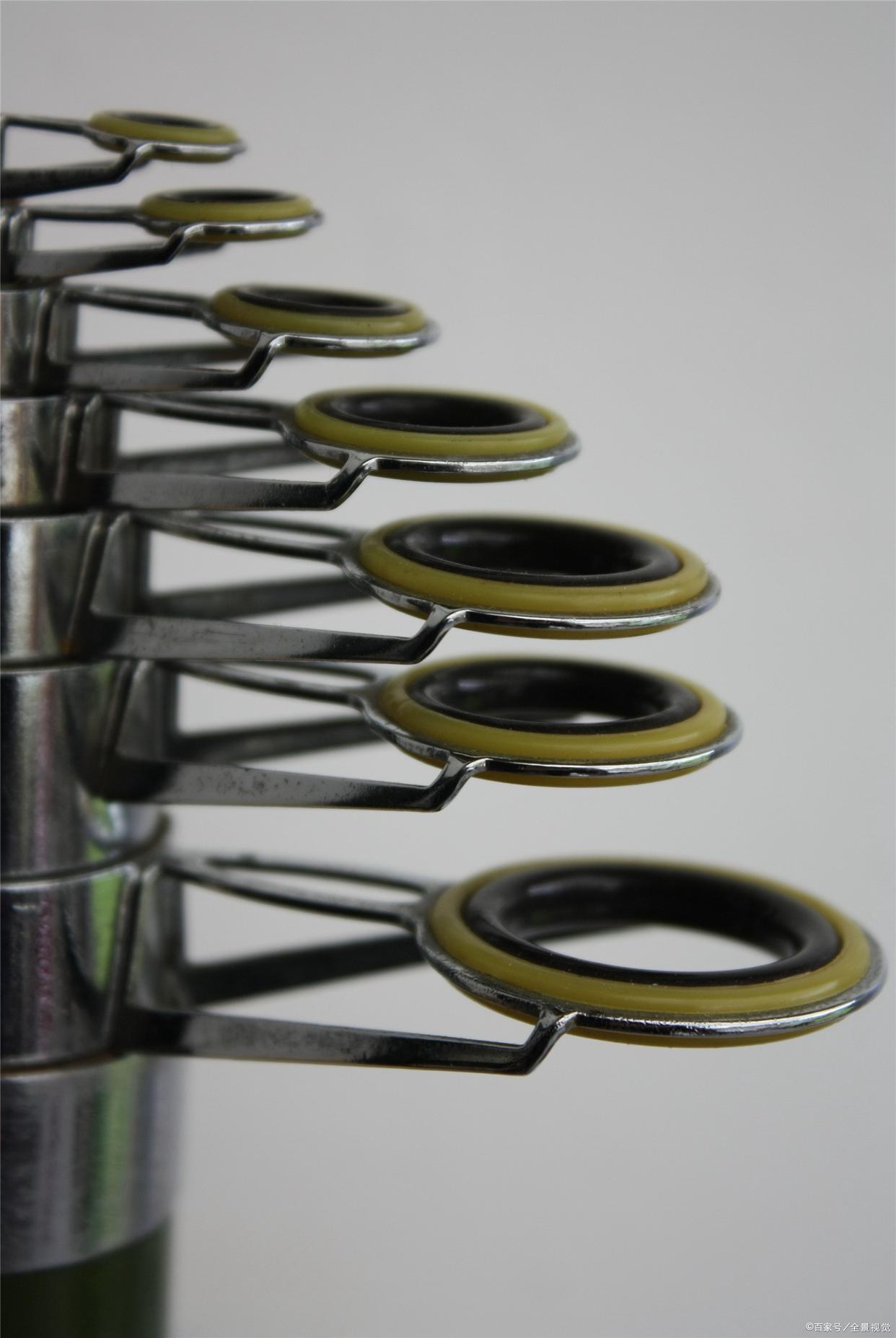 矶竿的导环,一般来讲矶竿导环比较稠密,第一节上顶环是固定的,还要有两到三个滑动的,第二节上也有一到两个滑动的,第三节向下一般都是固定的导环。