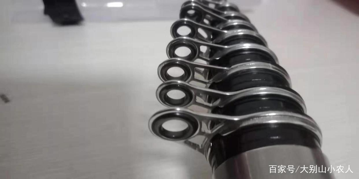 还有就是导环的材质也是需要注意的地方,一般情况下,选择陶瓷材质的环圈和钛合金材质的导环支架,是比较好的选择,既能护线又能防缠绕和防脱落。导环的角度要选择斜切式的,最好是斜45度。至于导环的数量,也要适中适合,少了的话鱼竿整体受力不均,容易断杆,多了的话,抛投也费事,而且容易出现缠线问题,还是要根据实际使用情况来衡量。有的钓友就是这样自制矶竿,才用的顺手。