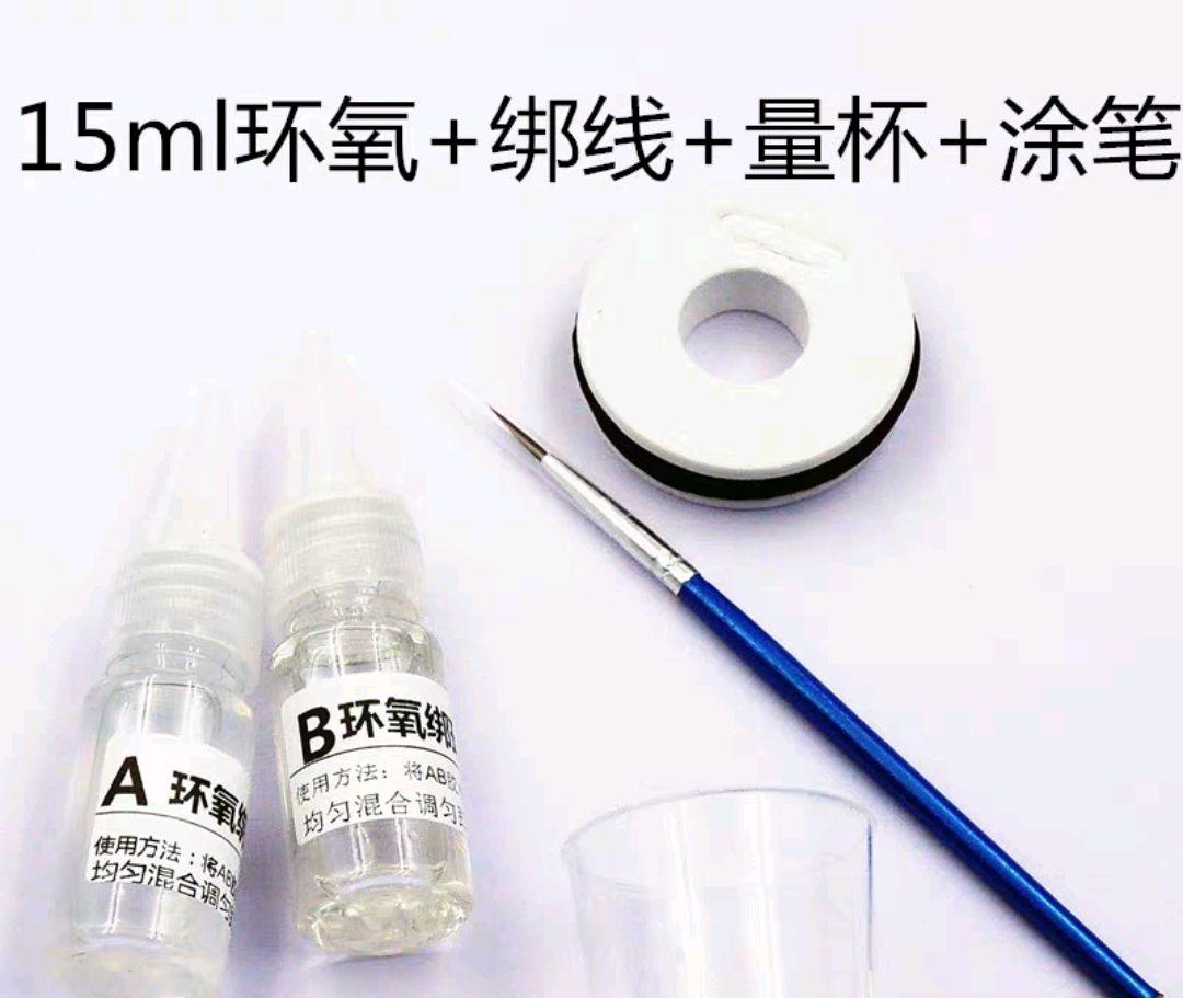 3、环氧气树脂胶:这种胶水凝固后是透明的,保留了鱼竿的原有色彩,且非常坚硬防老化。也是线组用于鱼竿导环的主要胶水。