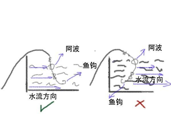 在调整好咬铅的情况下,在抛饵入水的时候,应该尽量保持饵在前,阿波在后。让钓组随着水流自然流动。应尽量避免阿波在前钓饵在后的情况。在急流作钓时要勤放线,不要打下饵料后就锁死线杯,这样水流就会把饵料向托,而阿波又会顺流而下,出现饵浮在水面上,而钓不到鱼。正确的做法是让钓组顺流而下,边流边放线,让钓饵始终在我们设定的钓棚深度流动,达到最理想饵钓同步状态。