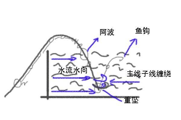有的钓友在急流作钓时喜欢用几十克的通心铅来抗流,这种做法是不对的,除非你的目的是纯钓底,因为这种做法已经和矶钓钓组的作钓思路产生冲突。此外这个做法还有一个不好的地方,因为重坠沉上极快,钓诱根本上就跟不上下沉速度,子线就会上扬,极易发生主线和子线缠绕的情况,所以切记在使用阿波钓组的时候不要加重坠。