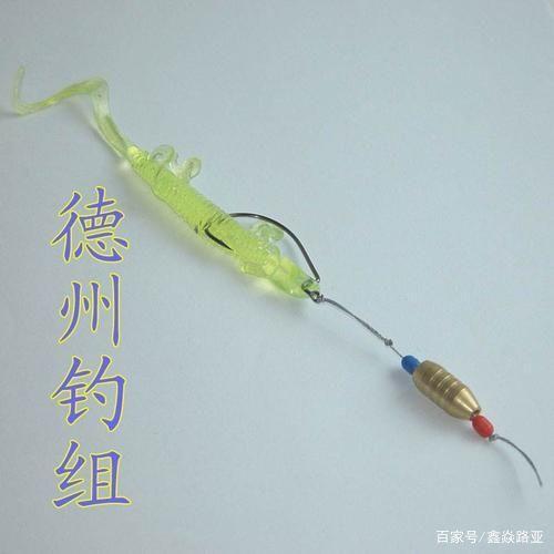 钓组需要由子弹铅10~20克左右,挡珠,曲柄钩(钓鲈鱼一般用三号钩),软饵组成。挡珠是橡胶制成的通心豆,加装在子弹铅和钩眼之间,防止子弹铅在搜索过程中不断撞击线结,损伤钓组。加入子弹铅的作用是可远投,且防止钩子挂底。