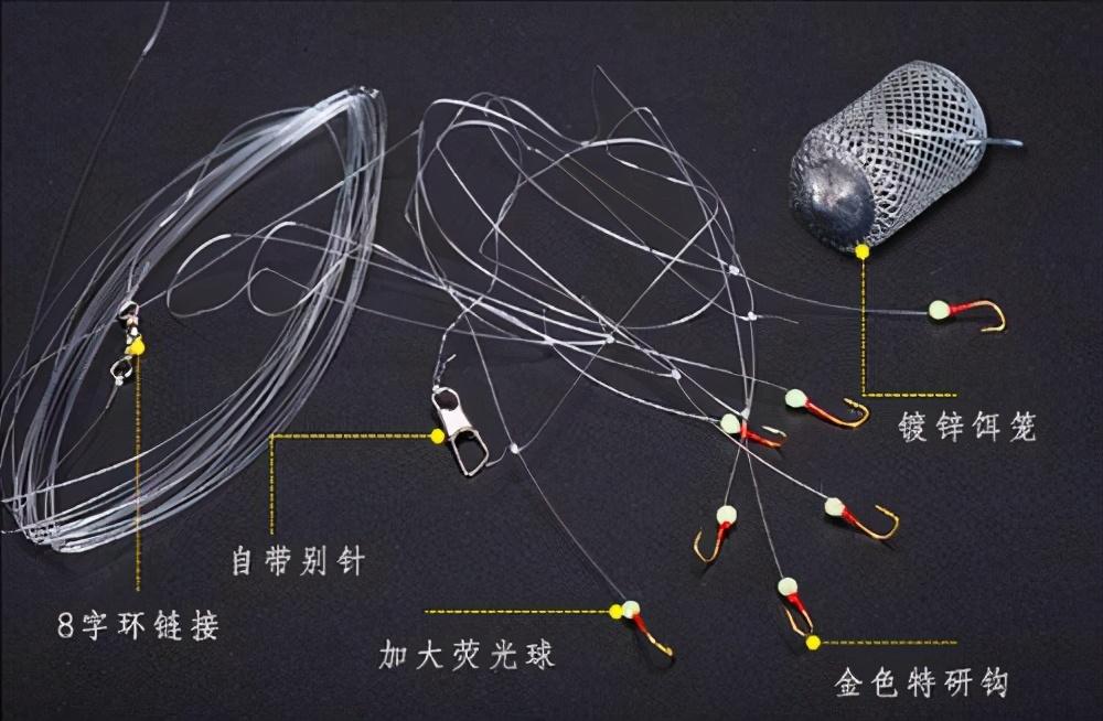 一组七星串钩有七枚金袖,也有15枚鱼钩的组合,鱼钩的钩柄处包裹着荧光棉,色彩非常艳丽,在饵笼中装入极易雾化的饵料,再配合金闪闪的鱼钩,对白条这种小体型鱼的诱惑力,非同一般。