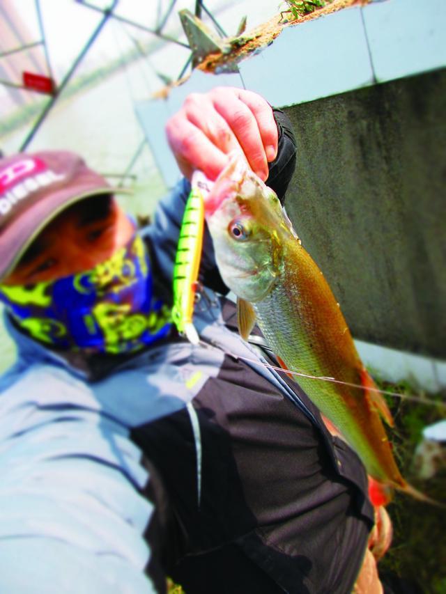 在出现第一次咬口不中的情况下,我们应马上停止作钓并更换拟饵或操作手法。一般亮片是非常受红尾青睐的,所以我们可先用亮片探路,发现有细微咬口但不中鱼的情况之后,要及时改用小克数或小个体的拟饵继续作钓,比如3.5克的铅头钩卷尾钓组、3~5克的小亮片、小米诺等,你会发现立竿见影的效果。在我看来,路亚红尾也是一种博弈,只有学会分析并理清思路,才能在稳中求胜。