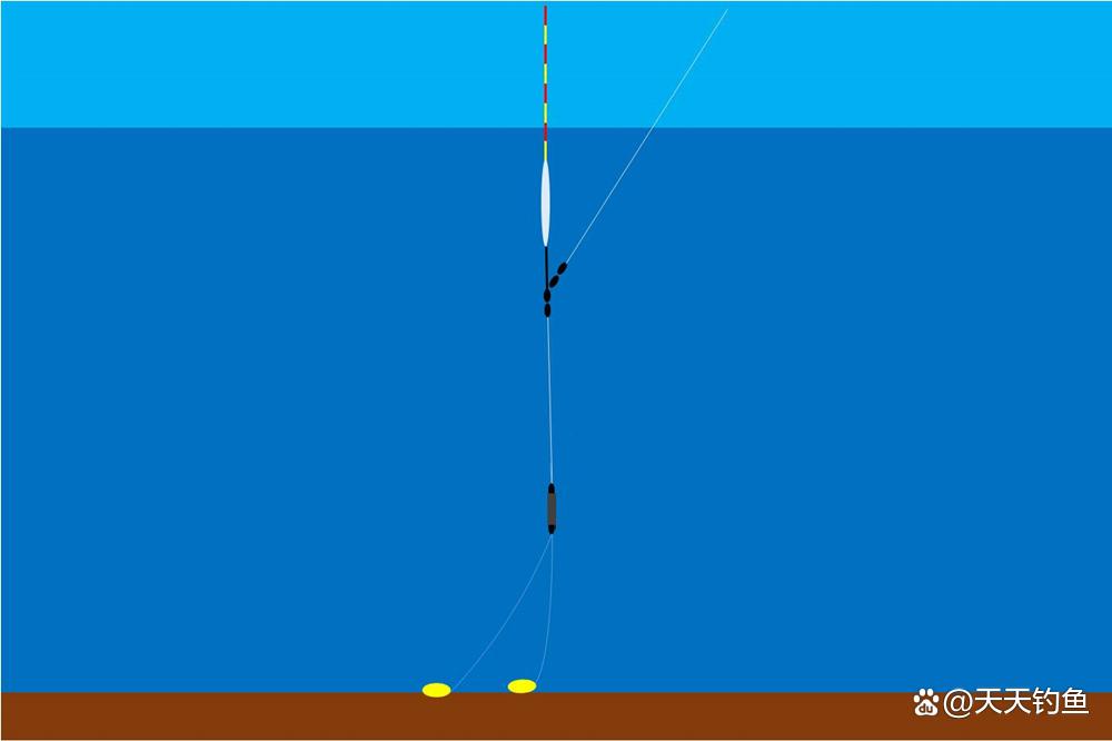 只要是野钓大鱼,必定是钓的比较钝,比较常用的调漂方法就是无钩调漂,采用不挂子线的方式半水调漂,然后子线找底,公式就是调几目钓几目,这样就是双钩完全躺底的状态了。可以比较好的固定住钓组,关键是双子线都松弛弯曲,不容易出现挡口的现象。很多钓友还会说长子线的适口性更好,其实是一个道理。长子线信号传递会稍慢一些,这在野钓大鱼时也有助于过滤杂鱼的吃口,凡是较为有力度的漂相,往往都是实口甚至是死口。其实长子线的缺点只有2个,一是摆动幅度大,这个当饵料很重时就不是缺点。