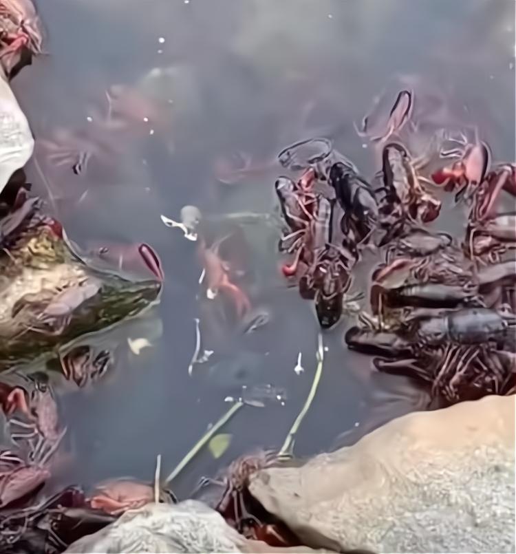 只见在山塘的边缘位置,爬满大量小龙虾,让人一眼望去都会的一种密集恐惧感。