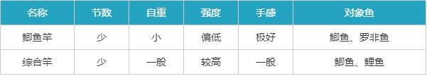 注:综合竿最大的特点是综合性能极强,既能钓鲫鱼、罗非鱼等小型鱼类,又能钓鲤鱼、草鱼等大型鱼类。