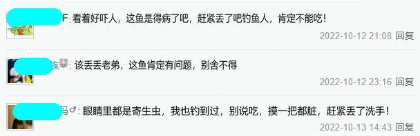 甚至有同样喜欢钓鱼的网友表示自己也钓过类似的大眼鱼,他认为这种鱼眼睛鼓起来是因为里面都是寄生虫——这种鱼别说吃了,就是摸一把都可能感染,所以也是连连劝这位钓鱼人将鱼丢了,并且要好好洗洗手……