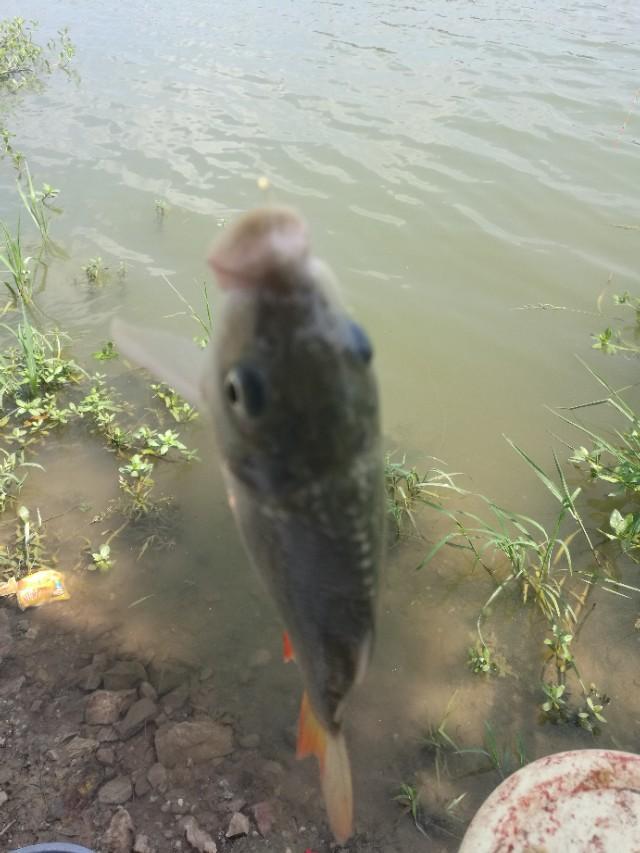 先搓了几竿大饵算是打了个小窝子,然后拉饵作钓。大概半小时后浮漂开始慢慢有了轻微的动作一一窝子里来鱼了。接着一个轻轻上顶后直接黑漂,提竿,中鱼。还有点力道。飞上来一看是这玩意