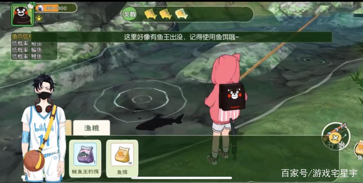 来到地点后,可以发现河流里有鱼影攒动,说明下面有鳊鱼王,走进会获得提示,这里选择使用鳊鱼王专用鱼饵来钓鳊鱼王。