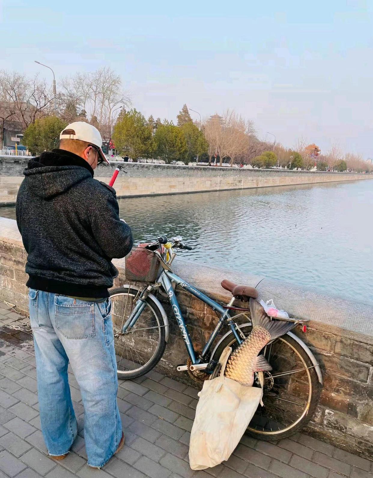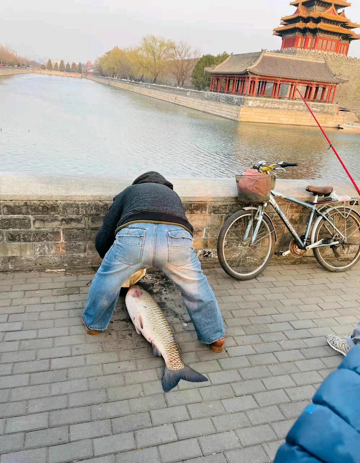 拍下这一幕的路人周先生目瞪口呆表示,自己也是一位钓鱼爱好者,但从来没想到竟然还有人敢到故宫护城河里钓鱼——而且一下就钓起来这么大一条“草鱼王”。