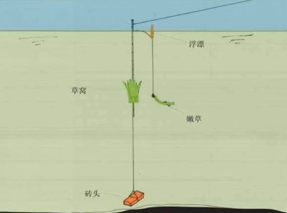 我们可以准备一捆新鲜的草料,用绳子捆绑好后用砖头沉入水底,此时需要留出一定长度的绳子,让草料浮漂在水体的中上层位置。跟着我们再将新鲜的草料挂在鱼钩上,接着抛投到钓点附近,静待草鱼咬钩即可。