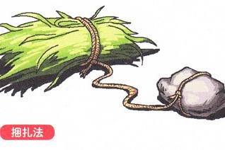 夏秋中午、下午,水面表层温度高,草鱼多在水域的中下层游动、觅食,故宜半浮钓。半浮钓,也要先打草窝。但是与浮钓不同,半浮钓需要把青草捆成一捆,然后用绳子一端捆住青草根部,另一端捆在石头上,这时就需要算距离(吊绳的长度+青草的长度)。举个例子:如果大部分青草长30cm,然后捆石头那根绳子长20cm,那么我们就要将铅坠滑到离鱼钩50cm左右的地方,因为半浮钓草鱼最重要因素,就是要保证鱼钩能和水下的草尖大致保持在一个高度,不能钓底!