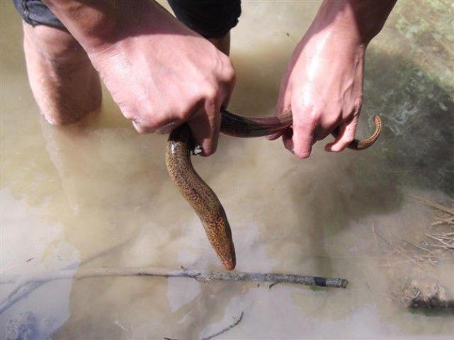 方法是:找一根自行车固定钢圈的钢丝,把一头磨锋利了,弯成钩状。用手握住长柄钢丝条钓钩,装上蚯蚓或蛆虫饵料,直接插入有鳝鱼藏身的洞穴。动作要轻,缓缓地上下抖动,诱引鳝鱼咬钩。