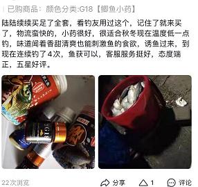 既然钓鱼小药这么重要,小编也是一位资深的钓鱼高手,在这里推荐自己用了2年的钓鱼小药——G18钓鱼小药,只要1勺小药,能把1个鱼塘的鱼聚过来,你也能十分钟钓上30斤大鱼。
