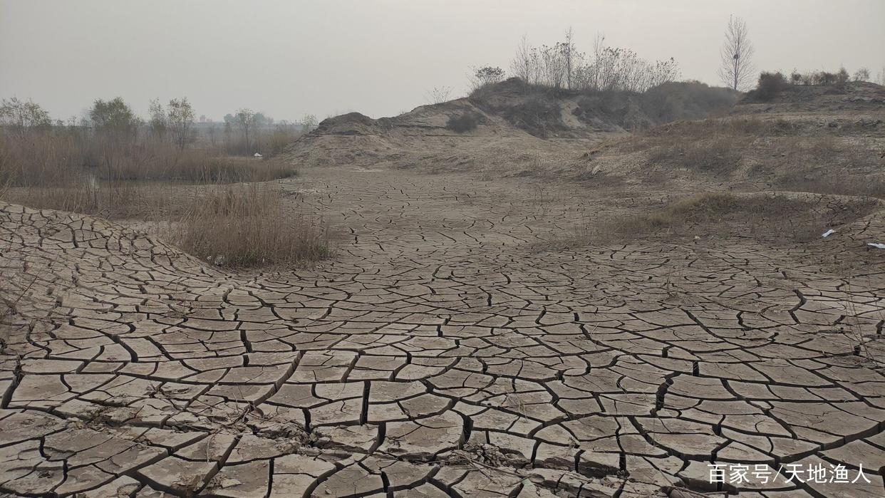 没拿渔具先下去查看了一下地形,然后带着渔具往东走找钓位。很多地方是洪水退后形成的淤泥路面,干裂成龟纹,走过形成一串脚印。