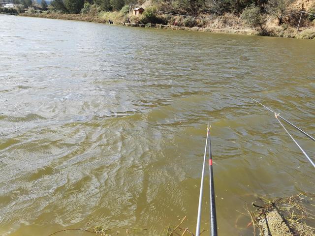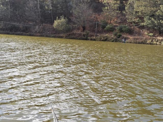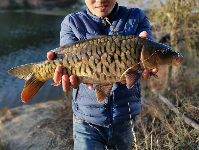 天阴的时间烤着太阳是最舒服最遐逸的享受,转眼半天的时间就过去,午餐也随便补充了些干粮填填肚子,都说钓鱼可以不吃饭,但是不能真的不吃饭那只是形容而已,当你饿得手脚发抖的时候基本也没办法钓鱼了,吃了干粮喝了口饮料躺在钓椅上沐浴着阳光,长杆的搓饵比较硬半小时基本钩子上都还附着,所以也不用管,就在享受着放松时瞄了一眼浮漂,发现浮漂没有了,水面上虽然冷风吹拂波光粼粼,但是醒目的四目浮漂真的不见了,赶快提竿刺鱼,炸线声随之而来,呜呜呜的睡意瞬间全没,之前就听说这个水库有巨物,结合第一次来水面跳呢欢呢大鱼其实我已经相信了,这次在看看手里5.4的杆子呈现的大弯弓,我更是深信不疑了,大鱼在水里左右逃窜,我仗着线组粗气定神闲,3+2的线组都还拉不起你来或许这就是命吧,大鱼的力气很大,足足博弈2分多钟才见到大鱼的真正面目,一尾3斤左右点的鲤鱼气喘吁吁的被我拉出了水面。