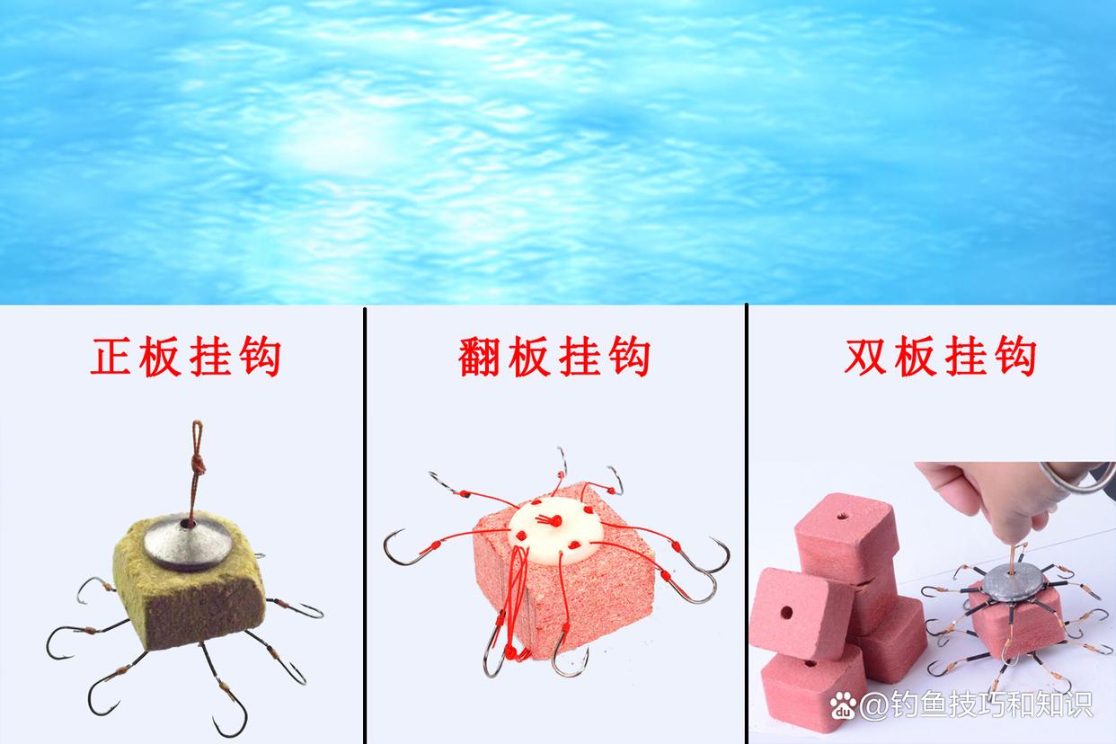 二、方块饵。顾名思义,方块饵就是方块形状的鱼饵。用模具把饵料压制成方块,中间留个圆形的孔洞,用于穿钩。方块饵是懒人野钓经常使用的鱼饵,近几年来,用方块饵钓鲢鳙很流行,方块饵入水以后,不断地雾化,形成饵料堆,把鱼钩包裹起来,鲢鳙鱼来吃饵时不小心就会把鱼钩吸到嘴里。方块饵挂钩的方式有三种,即正板挂钩、翻板挂钩和双板挂钩。
