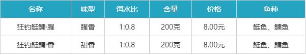注:狂钓鲢鳙是常用的商品饵料之一,以上狂钓鲢鳙的价格仅供参考,请大家购买时务必以实际价格为准。