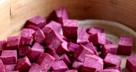 首先我们将紫薯切成小块,这里比较考验大家的刀工了,最好是能切多小就切多小,这样等下粉碎的时候会更容易。然后我们用粉碎机将紫薯块进行粉碎,由于我们选用的是新鲜的紫薯,因此只要使用平常我们制作虾肉的那种手摇式的粉碎机即可将其粉碎,一直粉碎刀成为紫薯酱为止!
